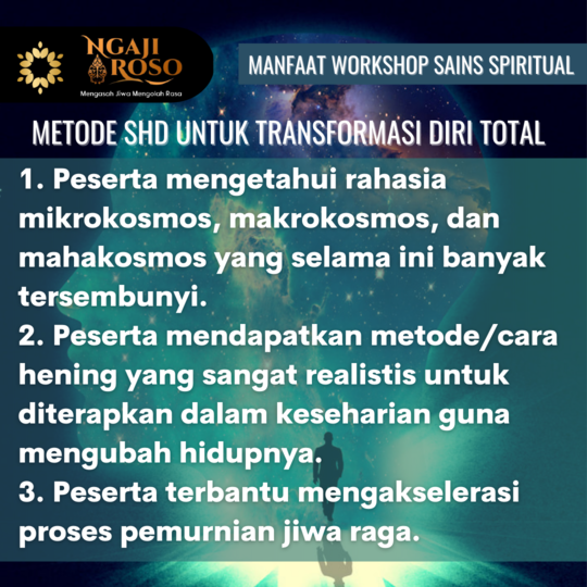 Ini adalah metode sains spiritual untuk pemberdayaan diri secara holistik, juga untuk mengaktualisasikan potensi manusia secara utuh. Metode ini dirumuskan oleh Setyo Hajar Dewantoro, Guru Spiritual dan penulis 10 buku bertema spiritual sejak 2016. Lewat pengalaman kultivasi/latihan spiritual yang panjang, juga spiritual odyssey di berbagai kawasan Nusantara hingga berbagai negara di Asia dan Eropa, Setyo Hajar Dewantoro secara nyata mengalami transformasi menuju hidup surgawi: hidup yang dilimpahi kebahagiaan, kesehatan, keberlimpahan, dan karya untuk kemanusiaan.