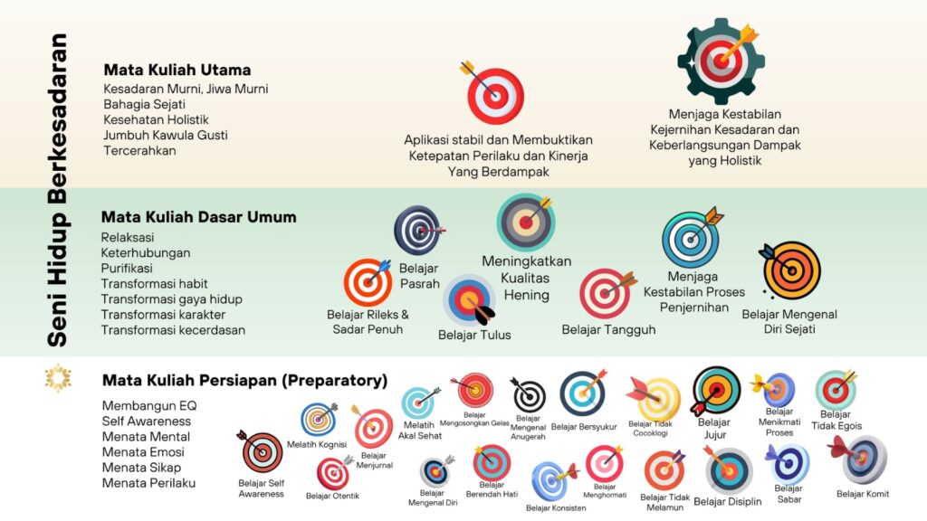 Metode belajar yang memberikan ruang perenungan sangat luas dan bebas dari belenggu kontrol, terpaksa dibuatkan kotak panduan reflektif mendasar yang bisa berjalan dengan autopilot akal sehat. Panduan untuk sekadar melatih sense of awareness yang hilang ditelan oleh normalisasi gelembung sisi gelap (shadows/ darkside)-nya sendiri. Sebagai bagian dari Kurikulum Mata Kuliah Persiapan (Preparatory) dalam membangun kecerdasan emosi (EQ), untuk belajar rileks dan mengenal diri sendiri dengan akal yang lebih tertata. Sehingga dapat lebih mudah menapaki tangga menuju ruang perenungan yang lebih luas dan kontemplatif. Melangkah maju kepada momen perenungan yang disertai dengan kejernihan pola berpikir dan kejernihan lapisan kesadaran.