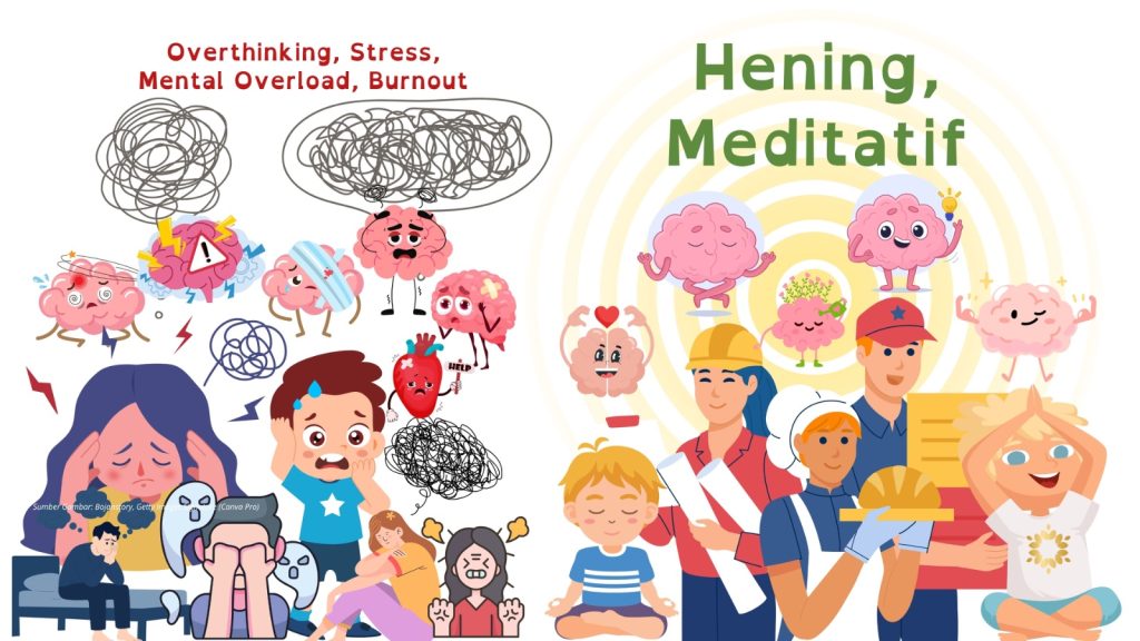 overthinking, sebenarnya yang penting adalah menjaga kestabilan kesehatan pikiran dan mental sepanjang hari, agar tidak bolak-balik stres dan overthinking lagi dan lagi. Karena repetisi yang destruktif inilah yang akan mendegradasi kesehatan dan kualitas hidup. Maka perlu meninggalkan habit berkubang dalam siklus yang tidak menyehatkan dan menimbulkan penyakit berat di masa datang. Apabila hanya mereset stres 15-30 menit saja dalam satu hari, lalu bagaimana nasib sisa hari apabila tidak terus dijaga dalam kesetimbangan ketenangan ‘Stillness. Stres dan overthinking baru akan muncul kembali, dan merembet efek domino ke banyak hal lainnya.