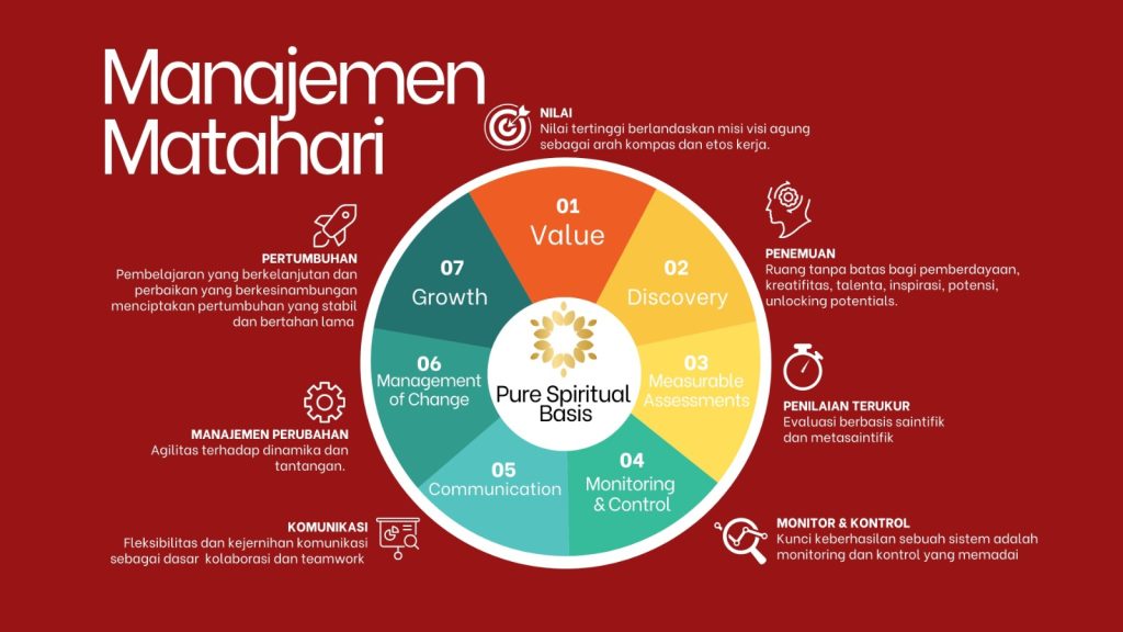 Berporos pada keteladanan dan perbaikan yang terus-menerus, maka Manajemen Matahari memiliki tujuh pedoman pengelolaan yang berasal dari Ajaran Spiritual Murni SHD yaitu sebagai berikut,
