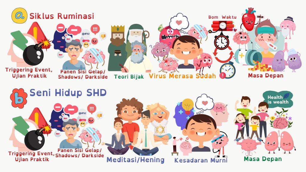 ‘Sisi Gelap (shadows/ darkside)’ yang terekam dalam lapisan kesadaran manusia, tidak bisa dibersihkan dengan teori bijak, afirmasi, komat-kamit doa, atau membayangkan terhubung dengan Guru SHD. Tidak bisa didetoks dan disembuhkan melalui intervensi tenaga ahli atau orang sakti, atau hanya dengan melakukan kegiatan yang membangkitkan hormon bahagia saja. Semua upaya pengalihan, merupakan alat bantu yang bisa membawa ke gerbang relaksasi saja, memberikan rasa nyaman yang sifatnya sementara. Maka perlu keberanian untuk melangkah dalam proses penjernihan diri yang permanen, yaitu melakukan meditasi/hening penjernihan diri disertai menjalankan ujian praktik. Dan, pada akhirnya, hasil tidak akan menghianati proses, akan tampak pada ‘Parameter Evaluasi Belajar’.